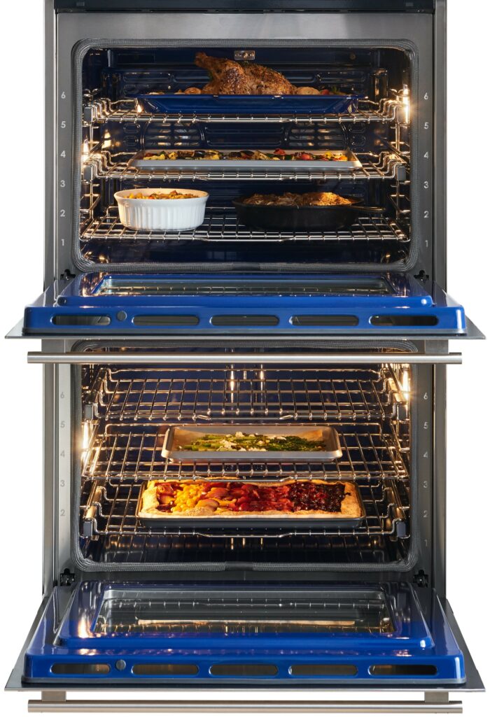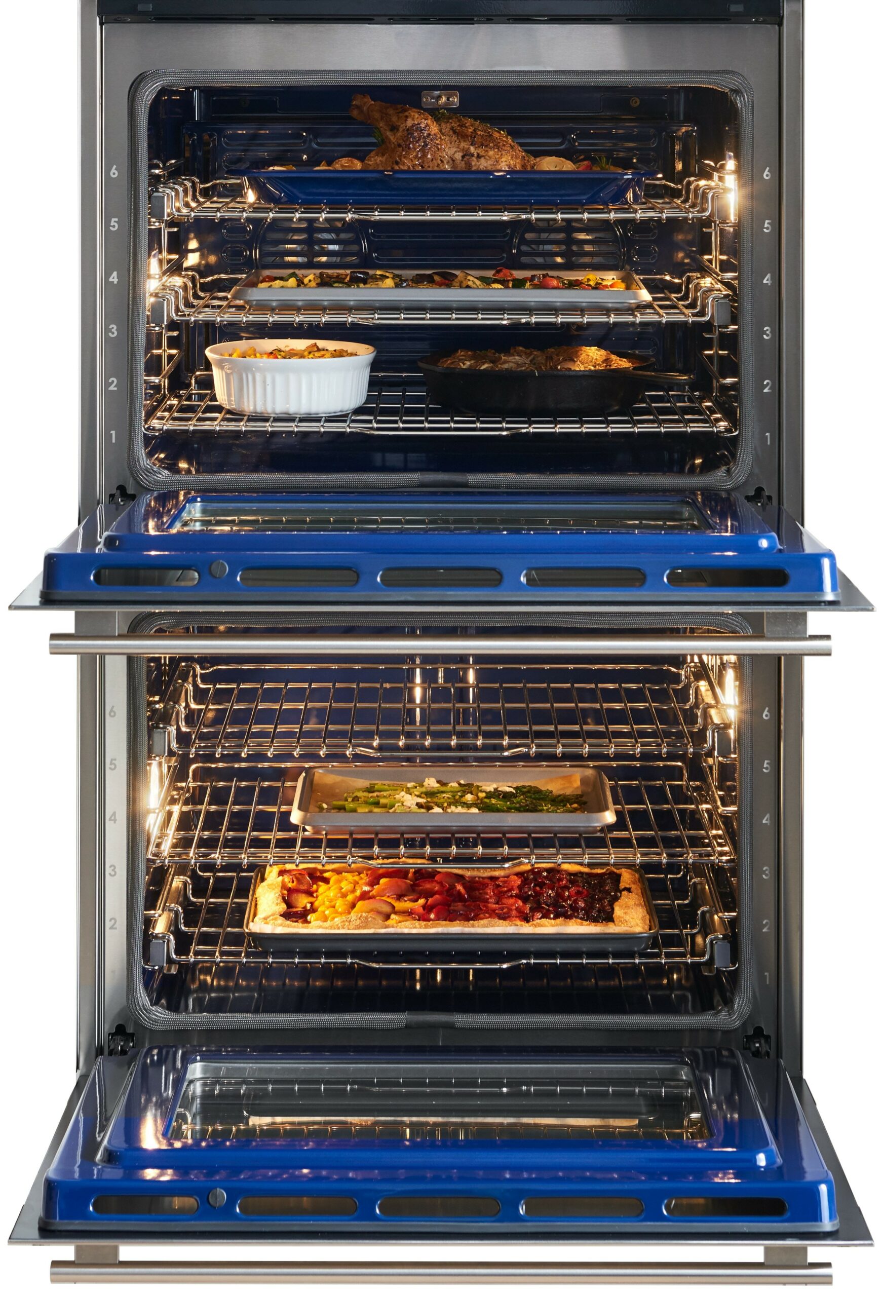 Wolf’s dual convection system—featured in the upper oven cavity—provides reliably even heat, reduces hot and cold spots, and enables consistent multi-rack cooking; Enjoy the extra space and versatility of the conventional lower oven; Take the guesswork out of cooking with 10 chef-created cooking modes, including Bake, Broil, Convection, Convection Roast, Dehydrate, Gourmet, Proof, Roast, Stone, and Warm; Gourmet Mode, featured in the upper oven, offers nearly 50 presets to automatically cook a delicious set of impressive dishes; The large full-color touchscreen and stainless touch controls are intuitive and easy-to-read; The temperature probe alerts you when your dish has reached the desired temperature; The oven offers self-clean, delayed start, timed cook, and Sabbath features; Control your oven from wherever you are using our convenient Owner’s App—remotely preheat, adjust temperatures, select modes, and more; Coordinates with other Sub-Zero, Wolf, and Cove appliances to create a cohesive look in your kitchen; Get the most out of your oven with tips and recipes from the Mastering the E Series Oven guide