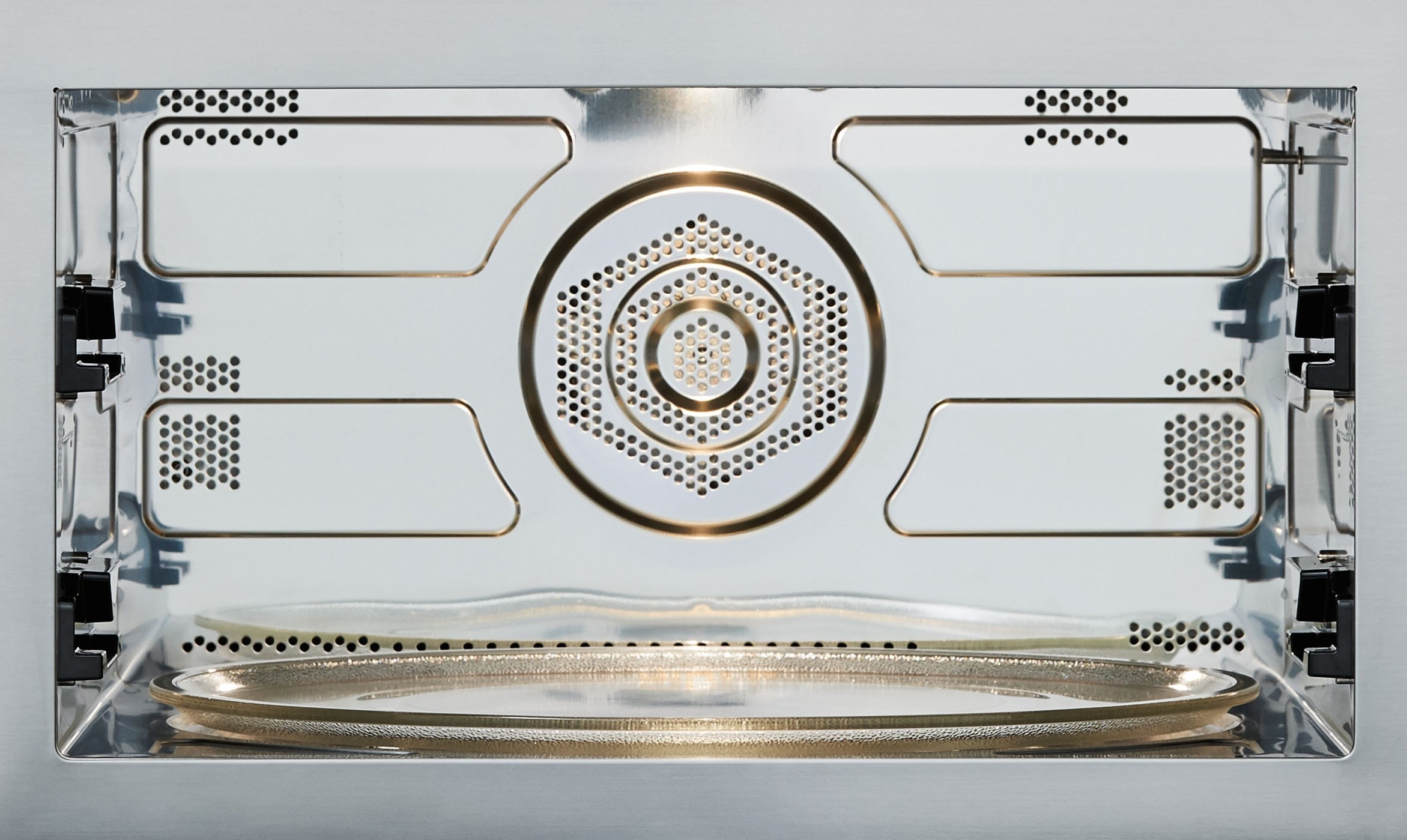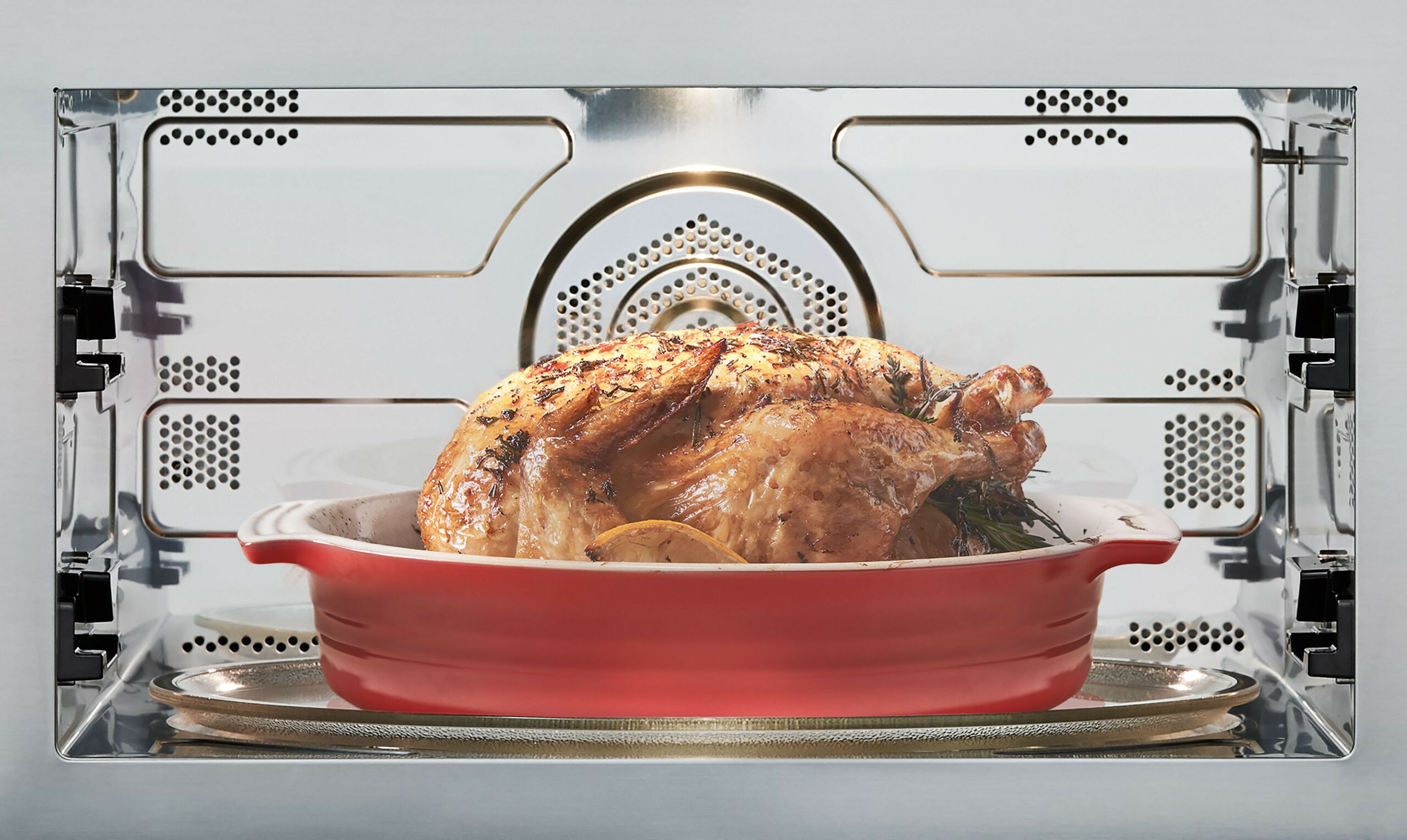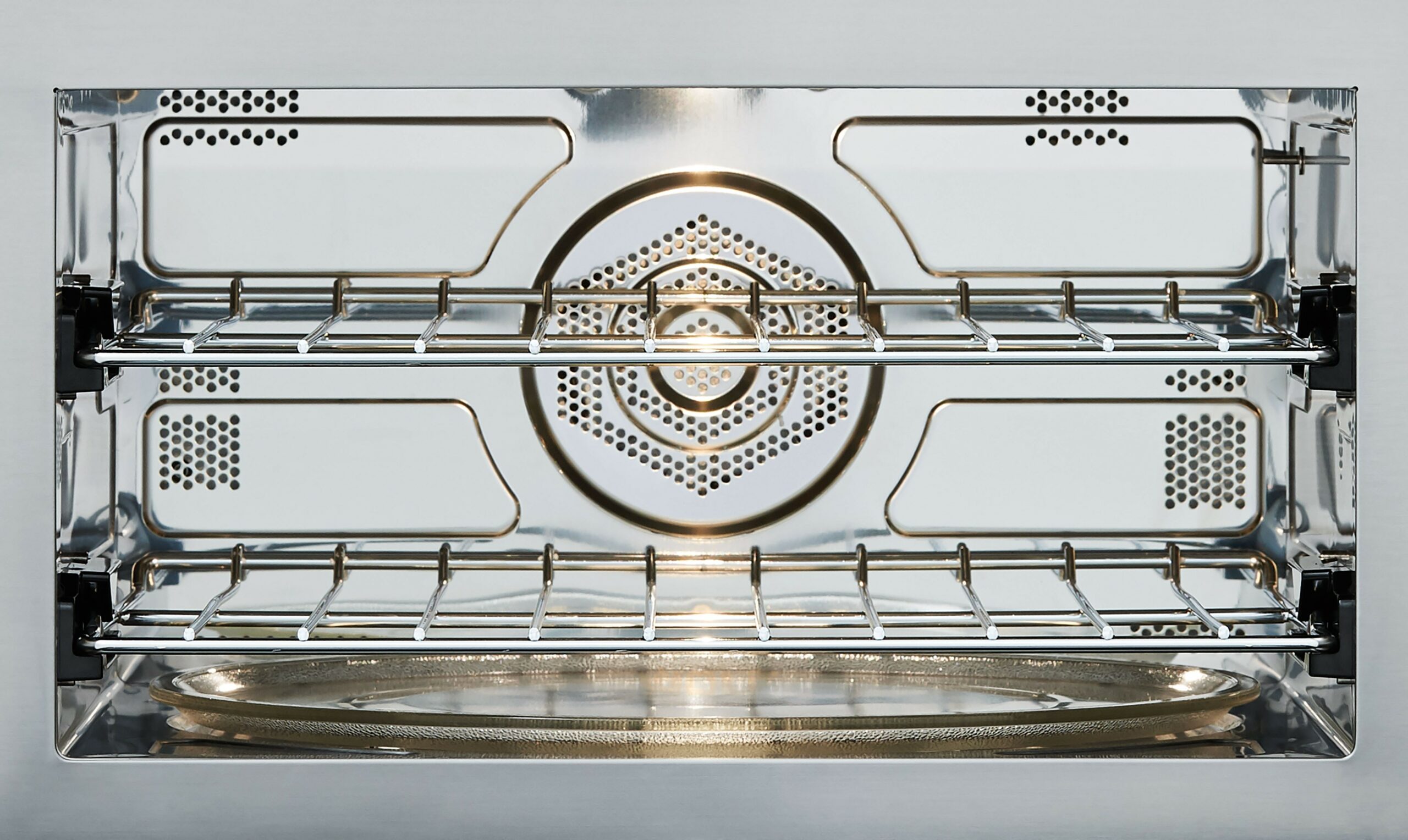 Combines microwave, convection, and broil technologies to provide all-in-one oven versatility; Provides more cooking power than a traditional microwave with the help of convection and broil; Assures predictably delicious results with 10 microwave power levels, convenient quick-start modes, and an intuitive Gourmet mode; Fits a 9-by-13 pan in the 1.6 cubic feet, stainless-steel interior; Micro Bake and Micro Roast modes reduce or completely eliminate preheat times; Frees up counter space with efficient drop-down door design; Coordinates with other Wolf built-in ovens and appliances with various handle and trim options; Master your technique with tips and recipes from the Mastering the Speed Oven guide