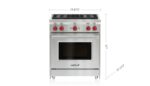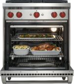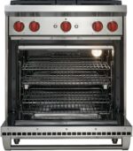 Control temperature precisely with four dual-stacked, sealed gas burners for higher highs, lower lows; Enjoy quicker heat and more even cooking with this large capacity gas convection oven; Produce crisper crusts and faster sears with the powerful infrared interior broiler; Accommodate up to four large pots or pans simultaneously on the wide cooking surface; Re-ignites flame automatically with our spark ignition system for improved temperature control and added safety; Move pots and pans easily across continuous cast-iron grates; Clean up sloshes and spills easily with the seamless, sealed, black porcelain-coated burner pans; Find your kitchen style with a choice of iconic red, black, or brushed stainless control knobs