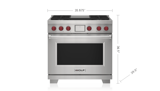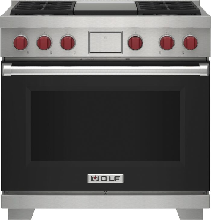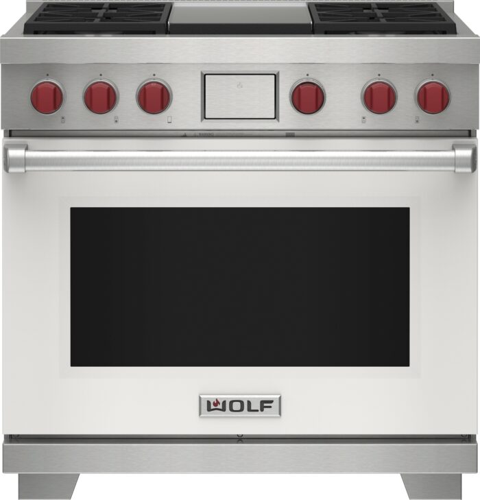 Make a statement with your choice of door colors and finishes for your Wolf Dual Fuel Range—classic stainless or new powder-coated black or white; Patented dual-stacked, sealed burners offer precise temperature adjustment; Burners produce up to 20,000 Btu for fast boils and intense sears and as low as 300 Btu for true simmers and melts; For improved temperature control and safety, the spark ignition system reignites burners automatically; Wolf’s Dual VertiFlow™ convection system provides reliably even heat, reduces hot and cold spots, and enables consistent multi-rack cooking; Gourmet Mode features nearly 50 presets that automatically control the oven to ensure delicious results; Take the guesswork out of cooking with 10 chef-created cooking modes, including Bake, Broil, Convection, Convection Roast, Dehydrate, Gourmet, Proof, Roast, Stone, and Warm; The redesigned 15,000 Btu griddle features even, precise heat, handling breakfast with equal finesse as seared proteins and stir-fried vegetables; The full-color touchscreen is intuitive and easy to read, discreetly hiding away when not in use; LED backlit control bezels illuminate when in use, indicating which burners are active; The oven offers self-clean, delayed start, timed cook, and Sabbath features; The temperature probe alerts you when your dish has reached the desired temperature; Control your oven from wherever you are using our convenient Owner’s App—remotely preheat, adjust temperatures, select modes, and more