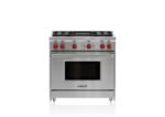 Control temperature precisely with four dual-stacked, sealed gas burners for higher highs, lower lows; Rely on a 16,000 Btu infrared charbroiler for more succulent steaks, chops, and burgers; Enjoy quicker heat and more even cooking with this large capacity gas convection oven; Clean up sloshes and spills easily with the seamless, sealed, black porcelain-coated burner pans; Produce crisper crusts and faster sears with the powerful infrared interior broiler; Re-ignites flame automatically with our spark ignition system for improved temperature control and added safety; Move pots and pans easily across continuous cast-iron grates; Find your kitchen style with a choice of iconic red, black, or brushed stainless control knobs