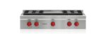 Maintain control with four dual-stacked burners that go from 20,000 Btu down to a mere breath of flame; Simmer and melt sauces, soups, and marinades easily with the lower tier of the dual-stacked burner; Match other Sub-Zero, Wolf, and Cove products with heavy-gauge stainless steel and signature red infinite control knobs; Sear in seconds with the additional 15,000 Btu infrared griddle; Cleanup is a snap as sealed, seamless burner pans contain sloshes and spills; Move pots and pans effortlessly across the continuous cast-iron grates; Reignites flame automatically with spark ignition system