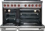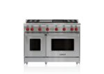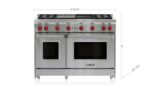 Control temperature precisely with four dual-stacked, sealed gas burners for higher highs, lower lows; Rely on a 16,000 Btu infrared charbroiler for more succulent steaks, chops, and burgers; Enjoy quicker heat and more even cooking with this large capacity gas convection oven; Multi-task with an additional 18″ oven.; Clean up sloshes and spills easily with the seamless, sealed, black porcelain-coated burner pans; Produce crisper crusts and faster sears with the powerful infrared interior broiler; Re-ignites flame automatically with our spark ignition system for improved temperature control and added safety; Move pots and pans easily across continuous cast-iron grates; Find your kitchen style with a choice of iconic red, black, or brushed stainless control knobs
