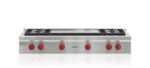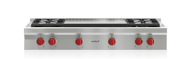 Maintain control with four dual-stacked burners that go from 20,000 Btu down to a mere breath of flame; Simmer and melt sauces, soups, and marinades easily with the lower tier of the dual-stacked burner; Match other Sub-Zero, Wolf, and Cove products with heavy-gauge stainless steel and signature red infinite control knobs; Sear in seconds with the additional 30,000 Btu double infrared griddle; Cleanup is a snap as sealed, seamless burner pans contain sloshes and spills; Move pots and pans effortlessly across the continuous cast-iron grates; Reignites flame automatically with spark ignition system