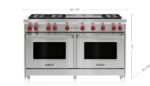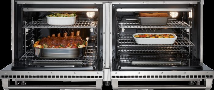 Control temperature precisely with six dual-stacked, sealed gas burners for higher highs, lower lows; Rely on a double 30,000 Btu infrared double griddle to sear burgers, stir-fry vegetables, and more; Enjoy quicker heat and more even cooking with this large capacity gas convection oven; Multi-task with an additional 30″ oven; Clean up sloshes and spills easily with the seamless, sealed, black porcelain-coated burner pans; Produce crisper crusts and faster sears with the powerful infrared interior broiler; Re-ignites flame automatically with our spark ignition system for improved temperature control and added safety; Move pots and pans easily across continuous cast-iron grates; Find your kitchen style with a choice of iconic red, black, or brushed stainless control knobs
